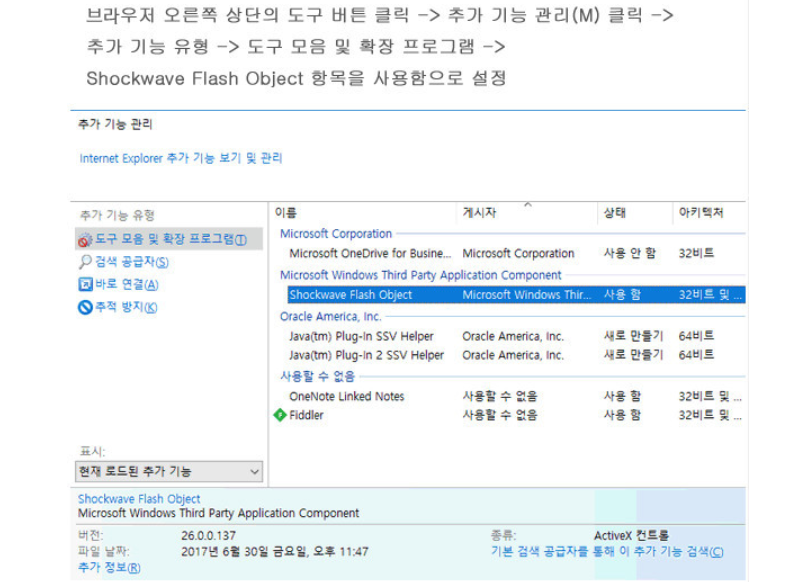 인터넷익스플로어 브라우저 플래시 허용 설정 방법 확인
