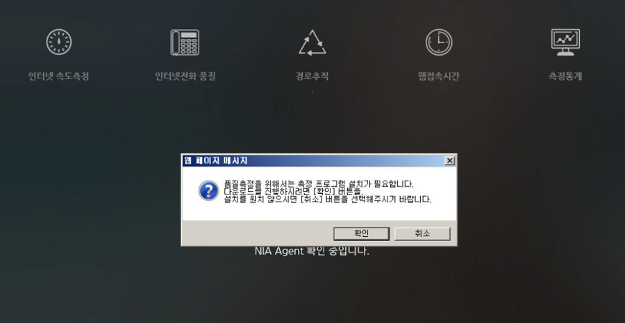 해당 홈페이지를 처음 이용하신다면 위와 같이 측정 프로그램 설치안내 팝업창이 열립니다. 설치를 진행하셔야만 정상적으로 인터넷 속도 측정이 가능하니 프로그램을 다운로드 하시고 설치를 진행해주세요.