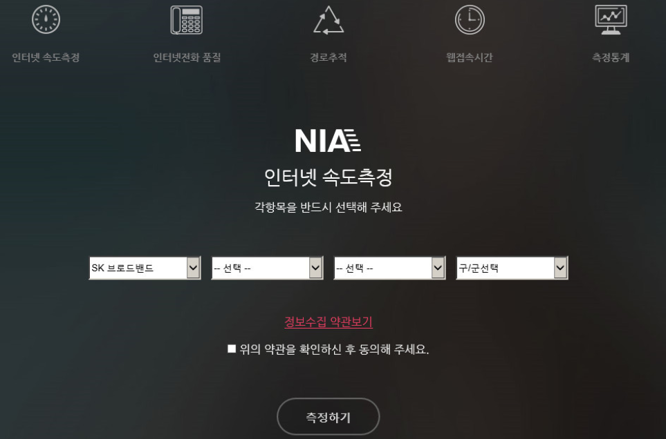 홈페이지에 접속하시면 위와 같은 세련된 화면을 확인할 수 있습니다. 이곳에서는 인터넷속도측정 뿐만아니라 다양한 정보를 부가적으로 확인할수 있죠. 당연히 우리가 원하는 인터넷 속도측정이라고 쓰여있는 메뉴를 선택하고 하단 부분에서 '인터넷속도측정'을 클릭해주세요.