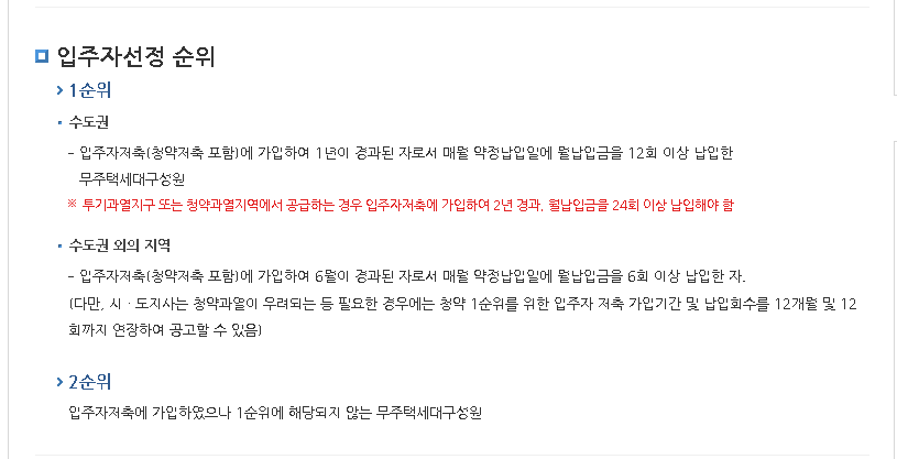 우리가 항상 이야기 하는 청약통장이 이런 부분에서 필요한 것입니다. 입주자 선정순위를 살펴보면 1순위와 2순위로 나눌 수 있는데요. 대부분은 청약저축에 가입하고 최소 1년이상 가입및 12회이상 납입한 무주택세대원에게 기본 가산점이 주어지는군요.