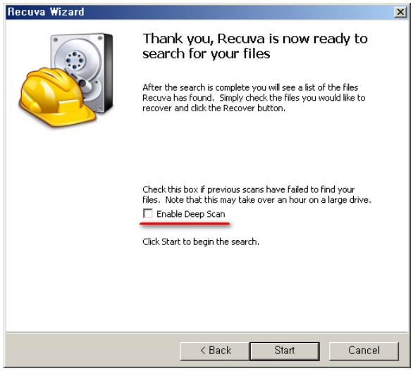 마지막 단계이죠. 화면에 있는 enable deep scan은 정밀한 검색을 할때 사용합니다. 삭제된지 조금 오래된 파일은 해당 기능에 체크후 하단에 start를 눌러주시면 됩니다. 단 검사 소요 시간이 늘어나게 됩니다.