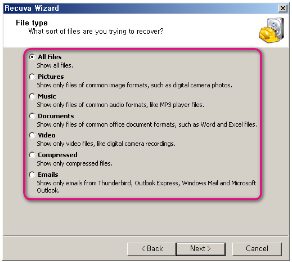 첫화면에서 Next를 누르시면 레쿠바 프로그램에서 어떤 파일(타입)을 복원할 것인지 지정할 수 있죠. 이미지, 음악파일등 몇가지 타입이 보이는데요. 다수의 파일이라면 All Files을 선택하시면 됩니다.