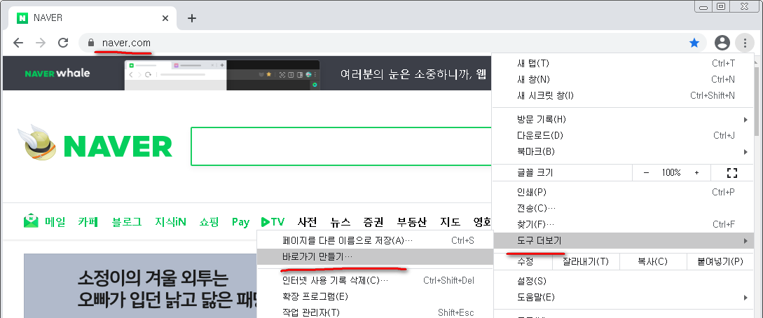 크롬 웹브라우저를 쓰신다면 클릭 몇번이면 저와 같이 바탕화면에서 사용하실수 있는 바로가기 아이콘을 만들어보실수 있습니다. 오른쪽 위에서 도구더보기 밑에 있는 바로가기 만들기를 사용하시면 네이버 아이콘을 만들수 있죠.