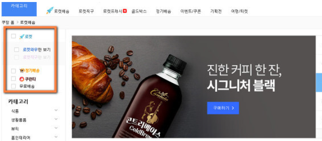 여하튼 쿠팡홈페이지에서는 여러가지 카테고리에서 원하는 물건을 찾기에 좋은게 필터에서 로켓배송 서비스를 따로 찾아볼수 있으니 이를 쓰는 것도 좋더군요.