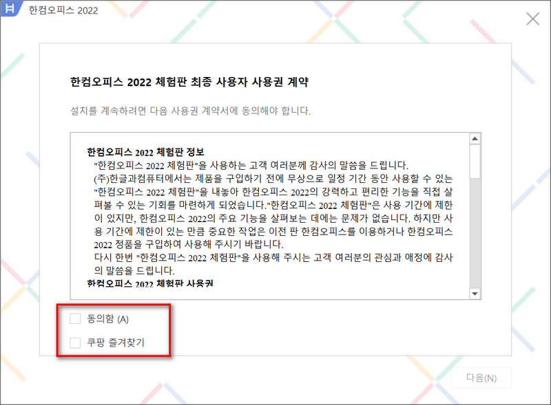 하단에 있는 동의함에 체크를 마우스로 눌러주시고 오른쪽 밑에서 다음을 선택하시면 인스톨이 자동으로 진행됩니다. 필요한 부분 잘 사용해보시고 기간이 끝나기 전에 구매를 결정하시면 될것 같습니다.