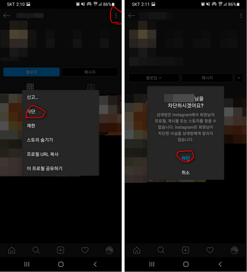 시작을 하실때 처음 화면에서 잠시 대기하시고 있다가 본인이 확인하고자 하는분의 인스타에 들어가시게 되면 화면 오른쪽 위쪽에 점3개가 찍혀져 있을껀데요. 이를 선택하시면 신고/제한/복사 등과 같은 몇가지 메뉴가 나옵니다. 거기에서 차단을 눌러서 잠시 차단을 해주세요.