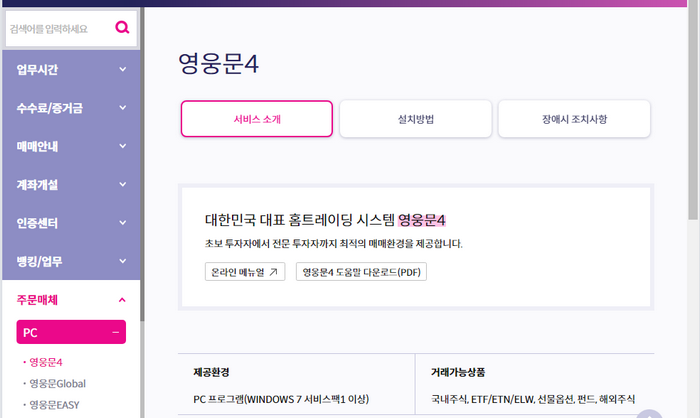 그러면 우리가 찾고 있는 영웅문 이라고 하는 것이 무엇인지 알아봅시다. 키움증권에서는 모바일과 컴퓨터에서 주식을 거래할 수 있도록 지원하고 있는데요. 영웅문이라는 것이 흔히 말하는 트레이딩 프로그램입니다. 스마트폰에서는 어플을 제공하고 PC에서는 영웅문 EASY와 같은 HTS를 제공합니다.
