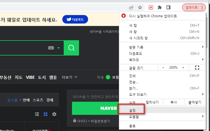 크롬 상단에 있는 점 3개 아이콘 선택 후 설정 메뉴 호출.