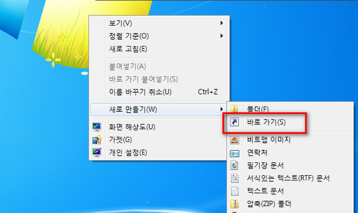 다른 방법을 알아봅시다. 바탕화면에서 마우스 오른쪽 버튼을 클릭합니다. 그리고 나서, 메뉴들 중에서 "새로 만들기"를 찾고 거기에 "바로 가기(S)"를 선택합니다. 입력 창이 열리면 주소 부분에 "https://mail.daum.net/"를 입력합니다.