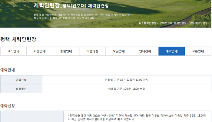 기본적인 회원가입 이후에 예약을 진행할 수 있습니다. 예약신청은 각 체력단련장별로 확인해보셔야 합니다. 평택체력단련장의 경우에는 이용일 기준 18~12일전 11시까지라고 안내되어 있습니다. 홈페이지에서 확인해보세요.