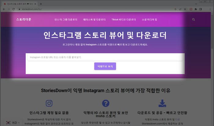 storiesdown.com은 아주 쉽게 이용하기 좋은 인스타그램 로그인 없이 쓸 수 있는 사이트입니다. 제일 좋은 것은 한글이 지원되기 때문에 익명으로 쓰고 다운로드 받기에 아주 편하답니다.