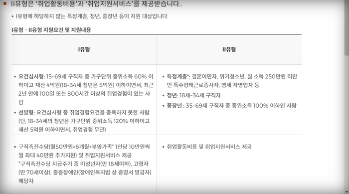 - Ⅰ유형: 소득과 재산이 적은 분들을 위해 구직촉진수당을 제공해요.