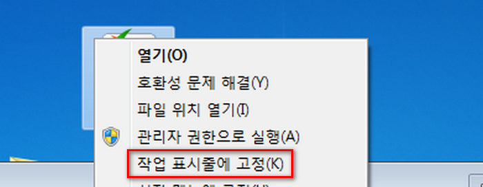 위에서 생성한 아이콘을 작업표시줄에 넣어 두면 쉽게 실행을 할 수 있어요. 자주 사용하는것이라면 꼭 등록하시기 바랍니다.
